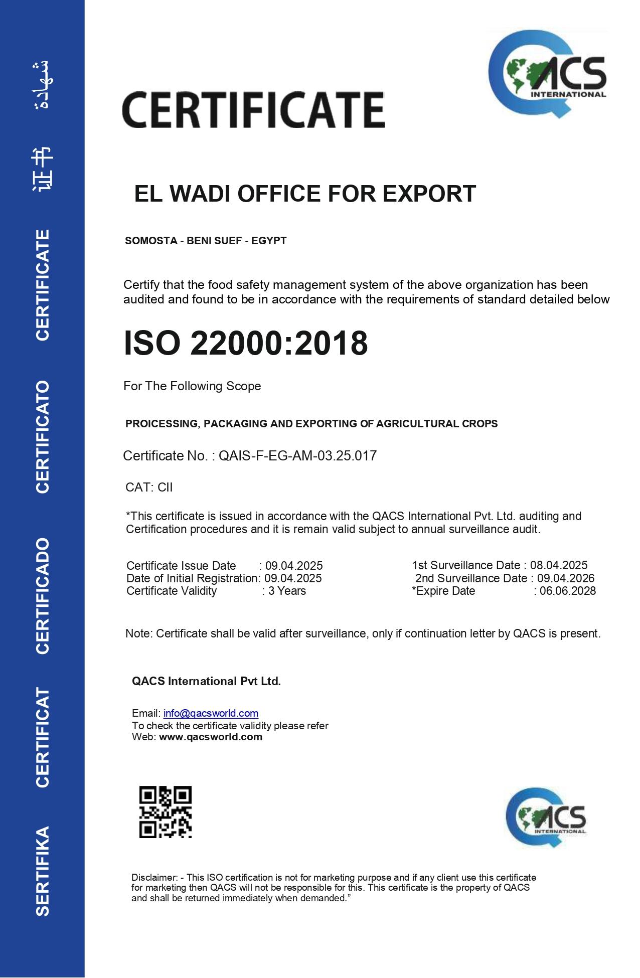 El Wady Import & Export holds internationally recognized certificates ensuring our herbs, spices, and seeds meet global standards of quality, safety, and sustainability.